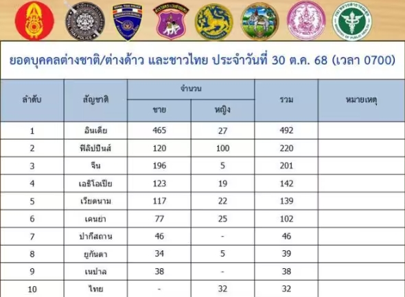 數據顯示,逃亡人員中以印度籍465人最多,其次為菲律賓籍220人、中國籍201人、埃塞俄比亞籍142人、越南籍139人。其他包括肯亞、巴基斯坦、烏幹達等多國公民,也包含32名泰國籍人員。整體性別比例為男性1,302人,女性261人。