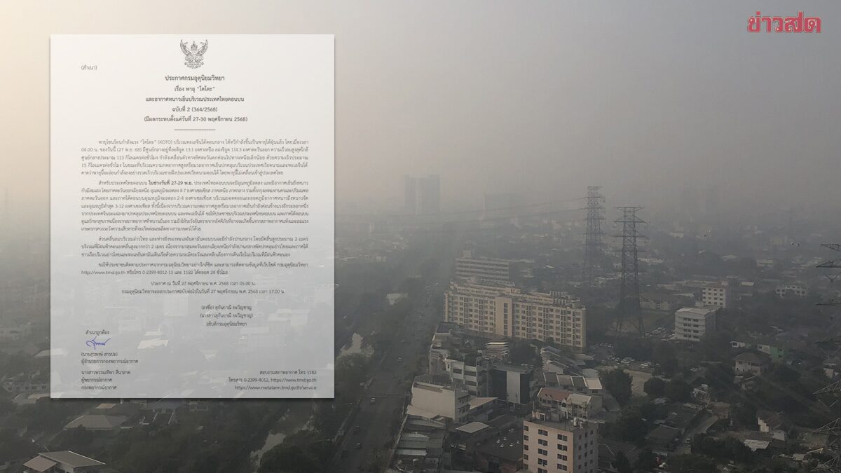 上部泰國地區(北部、中部等)受到颱風Koto的影響,氣溫將驟降7°C。特別是11月27–29日期間,上泰國將出現明顯降溫,天氣轉為冷至寒冷,並伴隨強風。