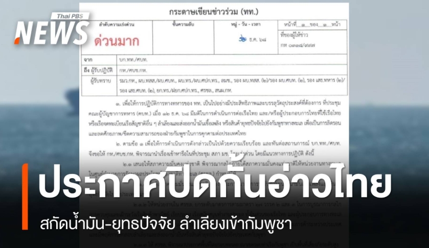 【泰國新聞報導】泰國最高司令部宣佈,將考慮封鎖灣,禁止向柬埔寨輸送燃油和戰略物資,柬埔寨港口周邊領海為高風險區域。