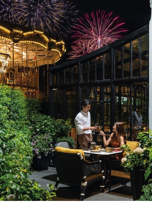 最大的亮點是玻璃屋內可以欣賞巨大的旋轉木馬,戶外的花園用餐區可以看見河景,也是很美。