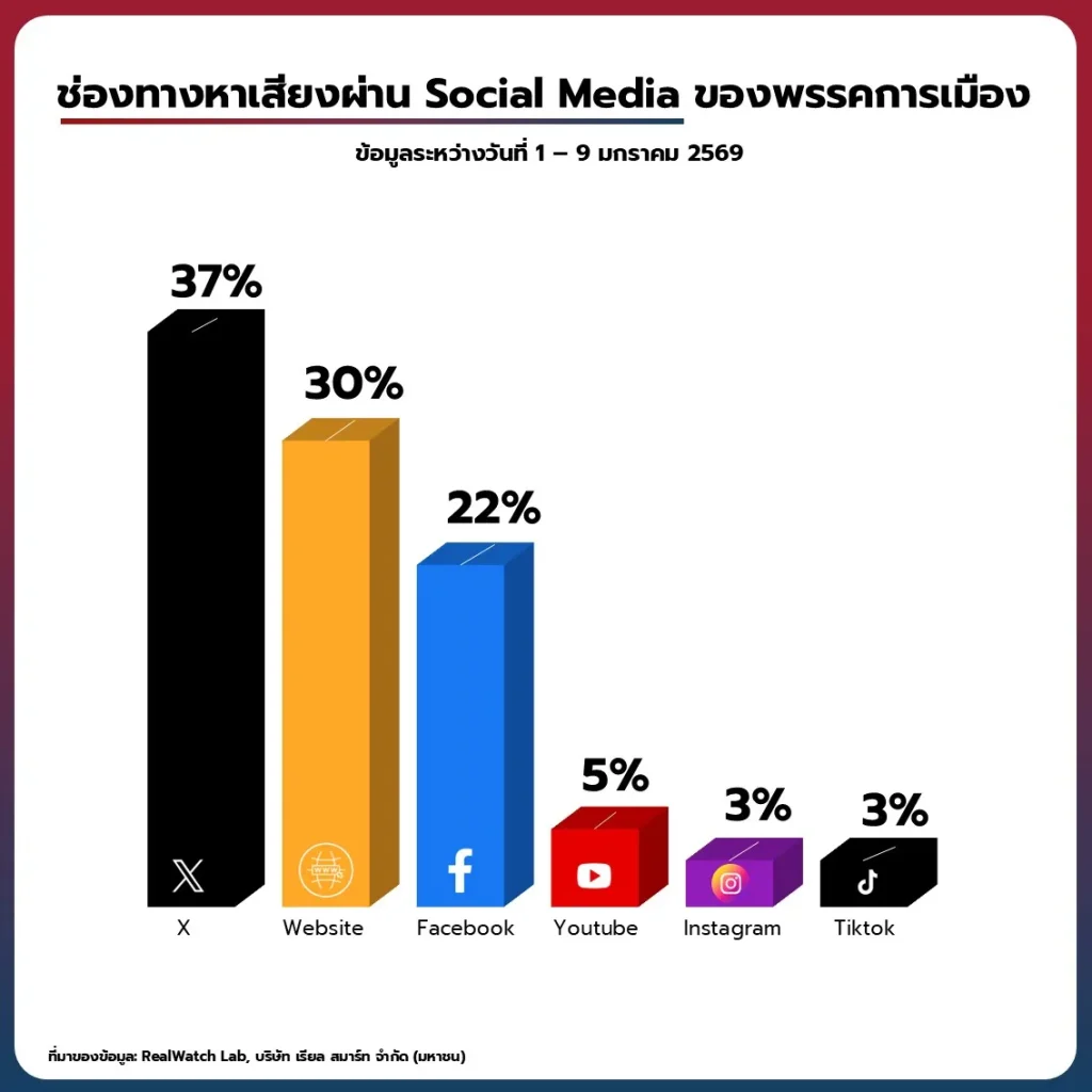 【泰國新聞報導】RealWatch Lab數據分析部門公佈一項針對本次選舉的調查結果,X平台(即為之前的Twitter)的成為逾60個政黨最常使用的線上競選管道,占所有線上媒體使用比例的37%,主要用於實時溝通,爭取Z世代選民的支持。排名其後的平台為Facebook,占22%;YouTube僅占5%,主要原因在於其內容形式偏向較長時間的演講與說明;而Instagram與TikTok各占3%。