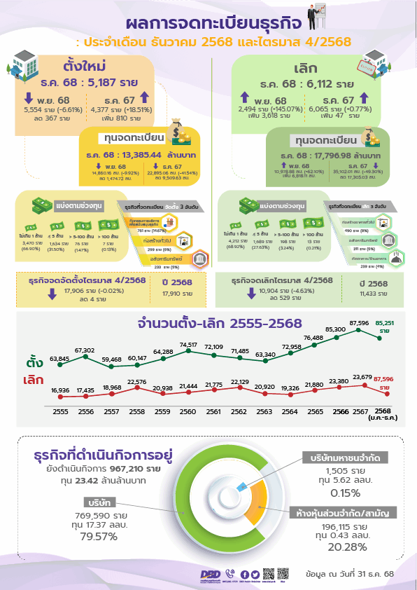 廳長普恩蓬透露,2025年12月新設企業5,187家,較2025年11月減少367家(-6.61%),較2024年12月增加810家(+18.51%)。註冊資本133.85億銖,較2025年11月下降9.92%,較2024年12月下降41.54%。