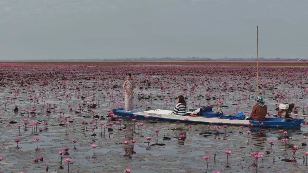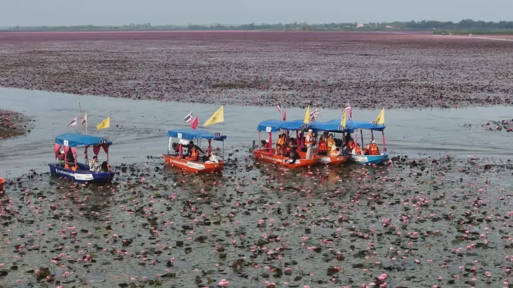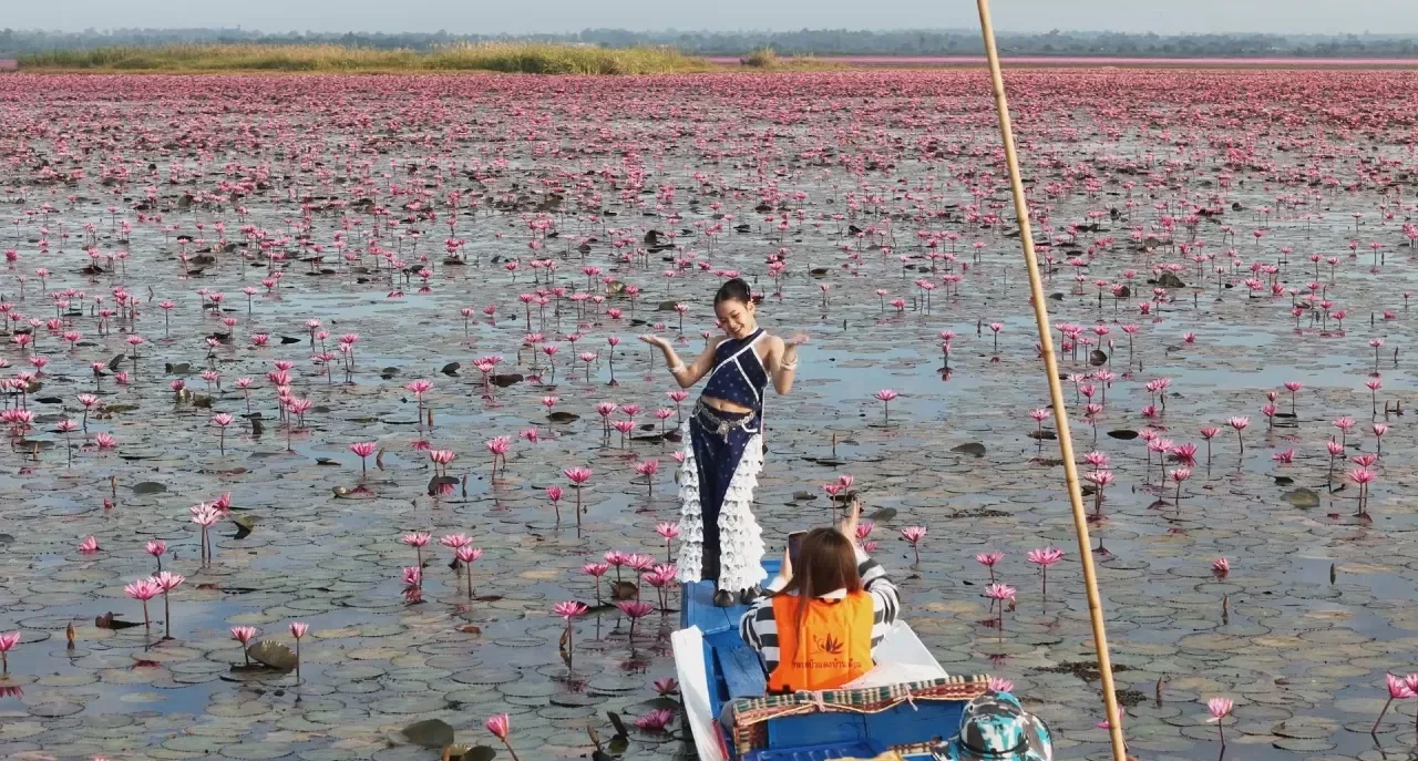 【泰國新聞報導】在烏隆他尼府Ban Diem碼頭發現,自今(24日)清晨起就陸續有大量遊客前來參觀紅蓮湖的美景。先前,國家旅遊局(TAT)發布一張知名泰國藝人Lisa Lalisa Manobal以紅蓮湖為背景的旅遊宣傳照片,引發高度關注。