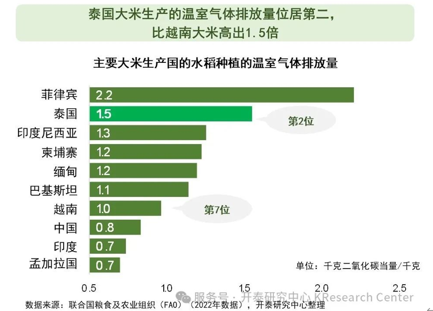 泰國大米的溫室氣體排放量在世界主要大米生產國中排名第二,而主要競爭對手越南的溫室氣體排放量較少,排名第七。此外,泰國大米對歐盟出口值約占大米出口總值的3%。儘管這個比例不大,且歐盟目前尚未將環保規則強制納入大米貿易規則,但未來歐盟可能會實施該規則。因此,泰國必須注重生產低碳大米,以保持未來在歐盟市場的競爭力。