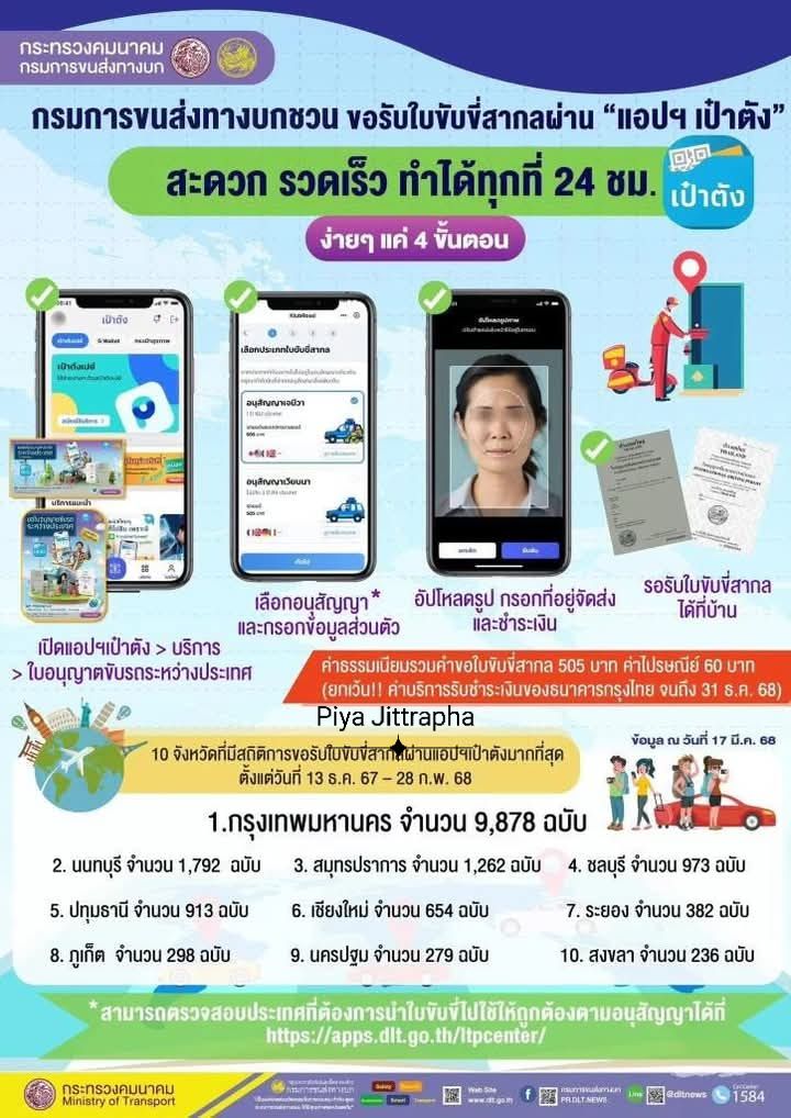 根據統計,自2024年12月13日至2025年2月28日,使用「Paotang」申請國際駕照人數持續增加,申請量最多的 10 個府分別為:曼谷9,878 份、暖武里府1,792 份、北欖府1,262 份、春武里府973 份、巴吞他尼府913 份、清邁府654 份、羅勇府382 份、普吉府298 份、佛統府279 份、宋卡府236 份。