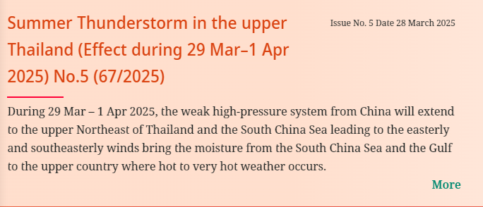 此外,在3月31日至4月2日期間,低壓帶將通過南海南部、泰國灣南部及泰國南部,進入安達曼海,導致泰國南部降雨增加,並伴隨強風和局部暴雨。民眾可隨時關注泰國氣象局的最新公告。