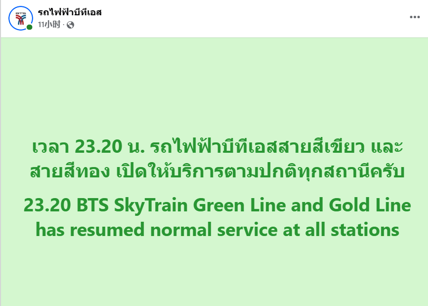 BTS官方表示,28日當晚23時20分,綠線與金線全線恢復運行。曼谷高速公路及大眾地鐵有限公司(BEM Bangkok Expressway and Metro)亦於29日5時08分宣布,藍線與紫線恢復正常營運。
