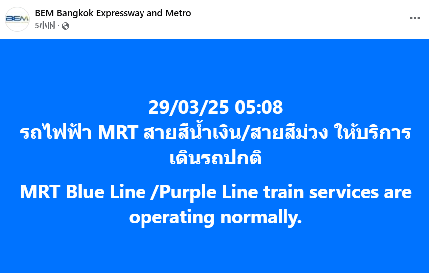 【泰國新聞報導】泰國BTS與MRT電車系統29日已恢復正常營運,此前因緬甸發生強烈地震,導致部分路線暫時停駛進行安全檢查。
