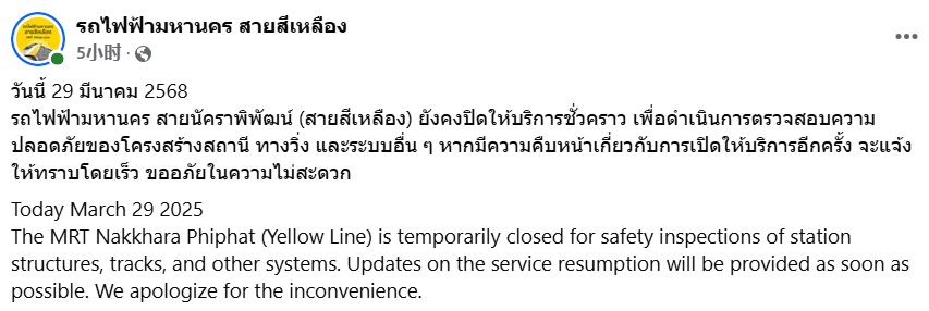 BTS綠線與金線、MRT藍線與紫線已恢復正常運行;然而,MRT粉紅線與黃色線仍暫停服務,正在進行安全檢查。