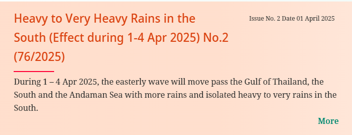 【泰國新聞報導】泰國氣象局於1日發布第2號警報,指出南部地區將迎來強降雨至特大暴雨,影響時間為4月1日至4日。此次天氣現象由東風波通過泰國灣、南部及安達曼海所引發,預計多地降雨量將顯著增加,局部地區可能出現特大暴雨,並伴隨突發性洪水及山洪暴發風險,尤其是山坡、水道附近和低窪地區。
