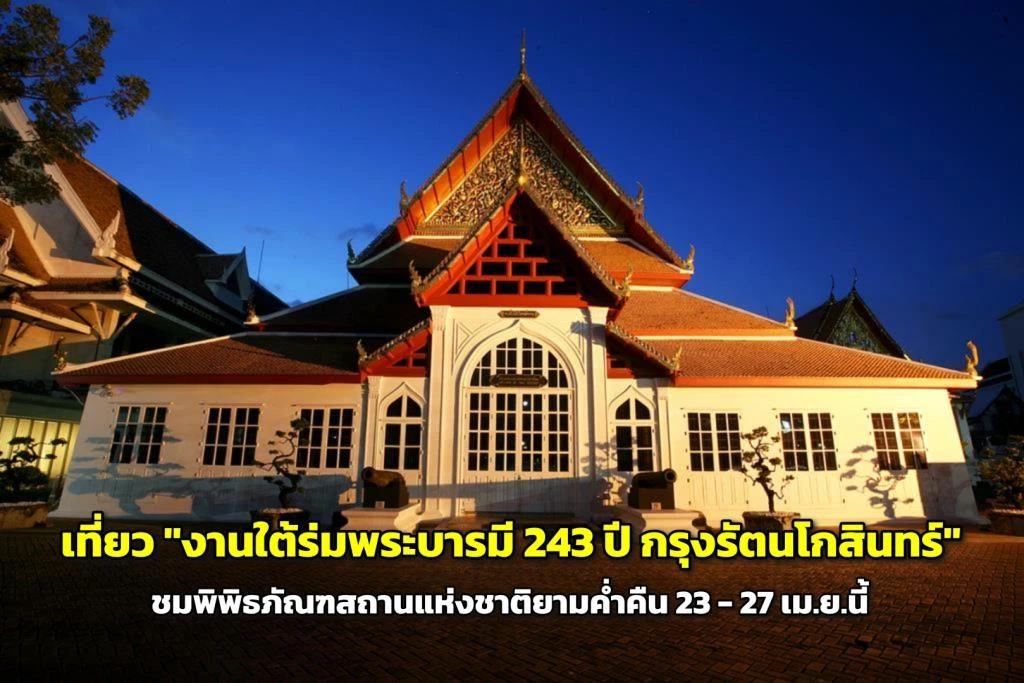 【泰國新聞特約記者江湖曼谷報導】曼谷明(21日)迎來建都243周年慶﹐泰國文化部聯合多個機構﹐於4月23-27日在曼谷舉辦一系列活動﹐以弘揚歷史文化﹐邀請市民、及遊客體驗奇妙的夜間參觀國家博物館之旅﹐促進人們瞭解歷史﹐感觸泰國文化的精深之妙。