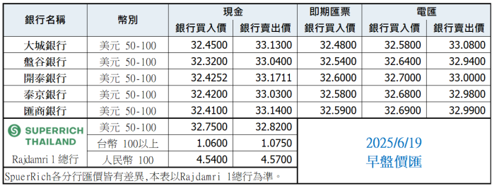 泰銖匯率比較表 6月19日早盤