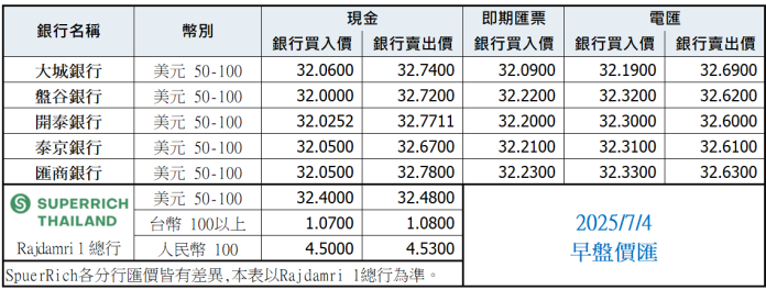 泰銖匯率比較表 7月4日早盤