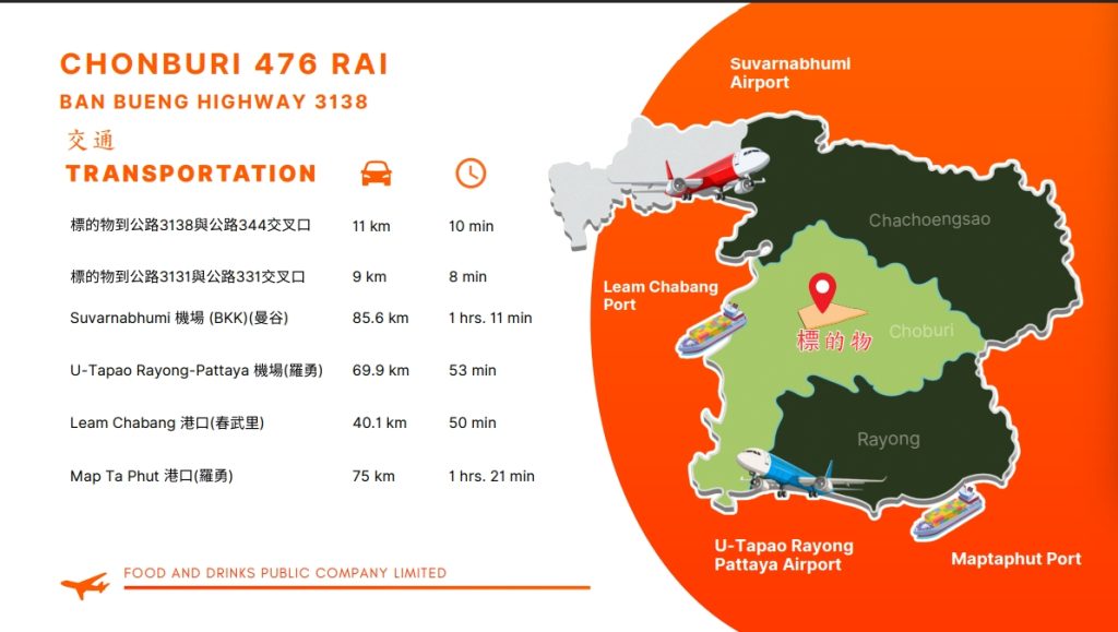週邊工業園區包括Pinthong工業園區1-4、WHA工業園區1-2、Rojana Nongyai工業園區1-3、Laem Chabang工業區。