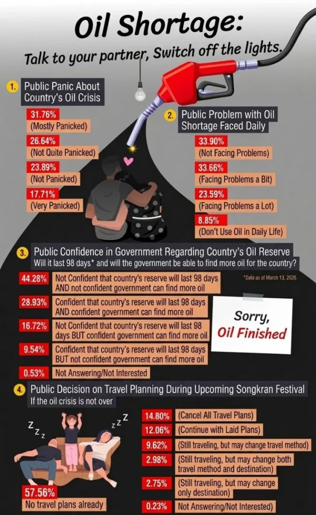 NIDA民調中心於3月17日至18日進行了名為「石油短缺」的民意調查,覆蓋了全國18歲及以上的1,310名受訪者,樣本涵蓋不同地區、教育水準、職業和收入群體。採用多階段隨機抽樣並通過電話訪談收集資料,誤差範圍不超過0.05,置信水準為97%。3月22日發佈的結果顯示,民眾恐慌情緒顯著,31.76%的受訪者表示「相當恐慌」,17.71%表示「非常恐慌」,兩項合計近半數;另有26.64%表示「並不太恐慌」,23.89%表示「一點也不驚慌」。
