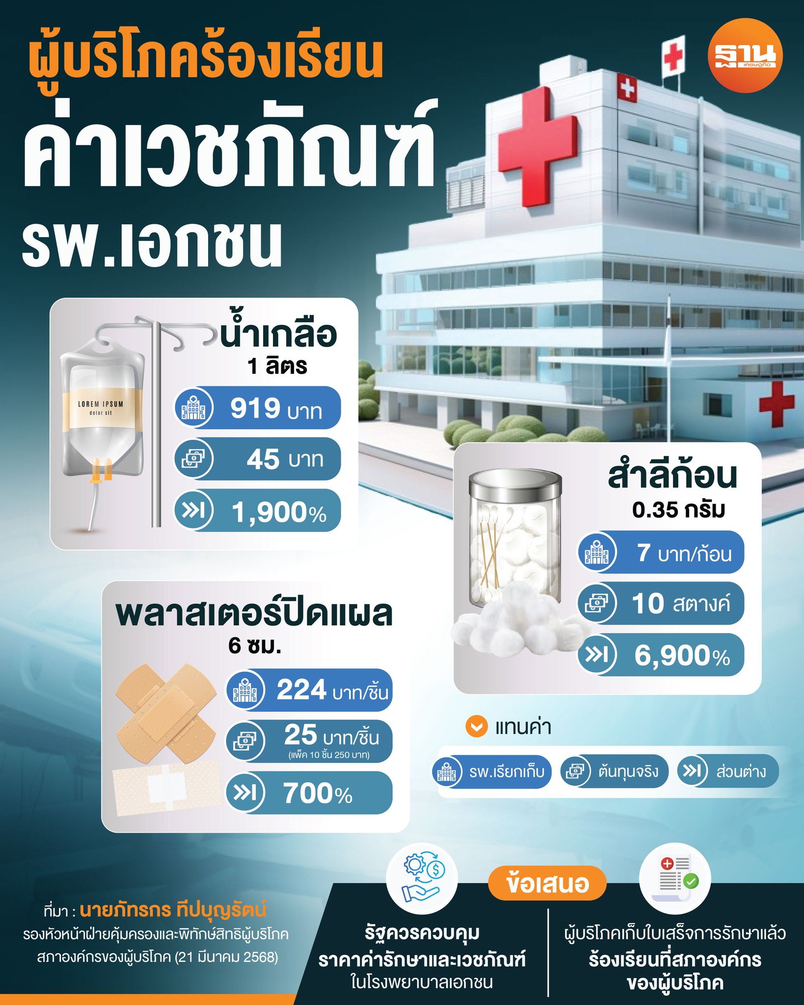 消費者組織24日公布部分醫療用品市場價格與私立醫院收費對比數據。如創可貼(6公分),市場價每片約25銖,部分私立醫院收費高達每片224銖,漲幅約700%;棉球(0.35克),市場價每顆約0.10銖,私立醫院售價7銖,暴增6900%;生理食鹽水(1000毫升,靜脈注射用),市場價約45銖,部分醫院收費高達919銖,增幅達1900%;醫療手套,市場價每雙2.5銖,醫院收費17銖,上漲580%。