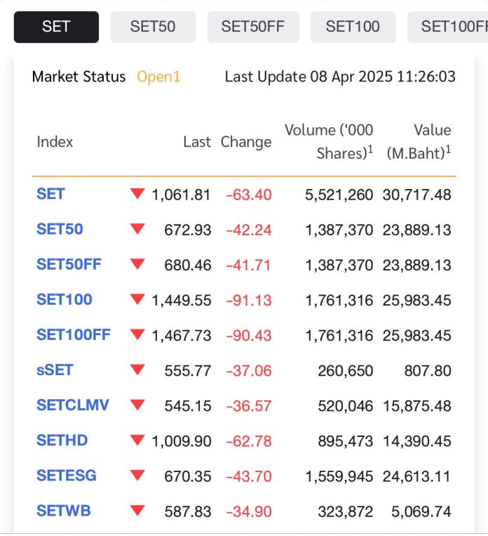 截止到发稿,泰股大盤8日重挫63.4點,SET指數降至1,061.81點。