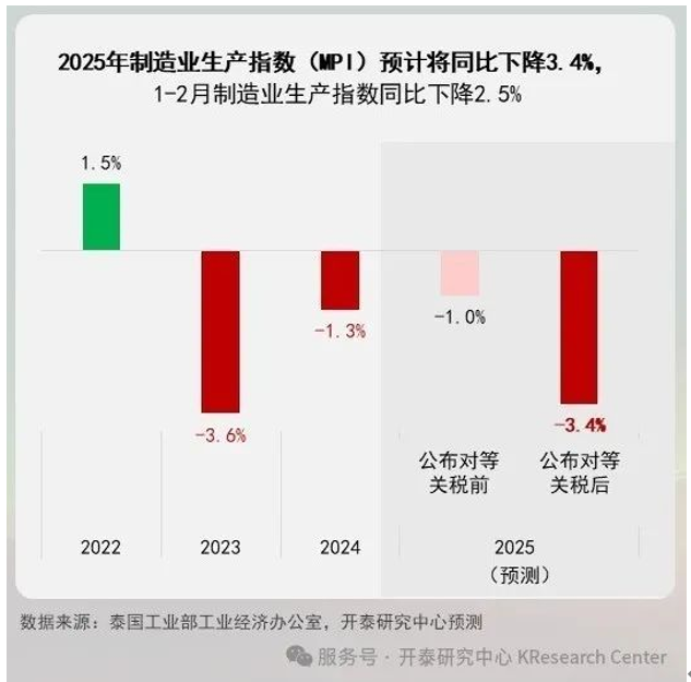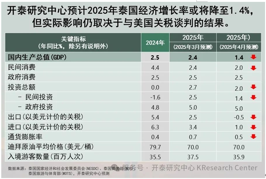 綜合各種因素,開泰研究中心預期今年下半年泰國經濟將大幅放緩。初步評估美國對泰國徵收高於預期的對等關稅加上地震影響將導致2025年泰國國內生產毛額(GDP)增長率減少1.0個百分點,因此將2025年泰國經濟增長率預測值從2.4%下修至1.4%。