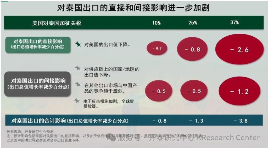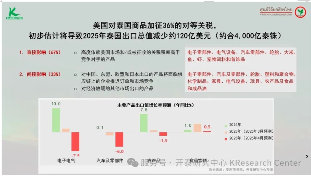此次美國宣布的對泰國徵收的稅率高達36%,大幅高於預期的10%。開泰研究中心初步評估,如果上述稅率被實際徵收,其直接影響和間接影響可能導致2025年泰國出口總值將從先前預測的增長2.5%轉為縮減0.5%,具體如下: