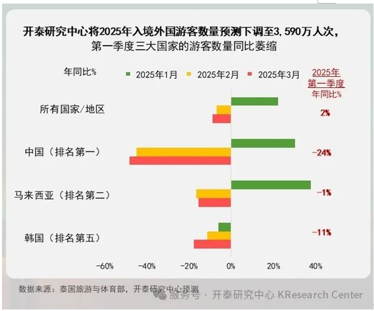 預期今年泰國入境遊客市場將受到緬甸地震波及泰國的拖累。在各國吸引遊客的競爭加劇和未來全球經濟放緩的背景下,自2月份以來,來自中國、馬來西亞和韓國等重要客源市場的遊客數量已經出現下滑趨勢,地震影響使泰國旅遊業更加雪上加霜。開泰研究中心將今年入境遊客數量預測值從先前預計的3,750萬人次下調至3,590萬人次。