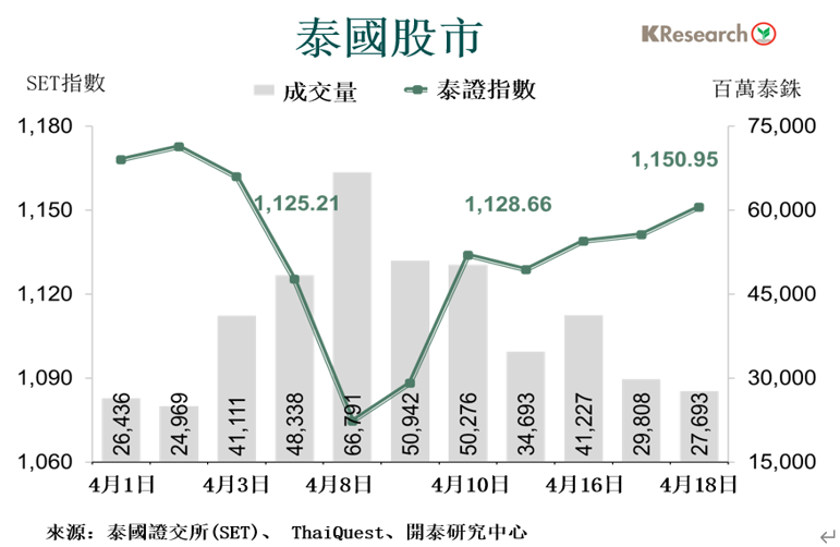 之後泰證指數因仍存在貿易戰的不確定性而窄幅波動,但於週五大幅上漲,主要受到發布業績前科技股和受益於國際能源價格上調的能源股的買盤支持。然而,本週銀行股表現不佳,受壓於除息日獲利拋售和投資者擔憂整體商業銀行第一季度業績的影響。