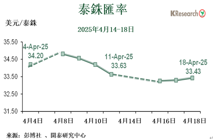泰銖在國內宋干節長假結束後隨人民幣等亞洲貨幣升值態勢而繼續走強,美元則因投資者擔憂貿易戰對美國經濟的影響而被拋售。此外,泰銖還獲得國際黃金價格再創歷史新高和外國投資者淨買入泰國債券的支撐而創近6個月新高33.08泰銖/美元。之後泰銖受投資者拋售以調整倉位和國際黃金價格放緩影響而略微走軟。美元則得以收復部分失地,支持因素為美國每週申領失業救濟金人數低於預期且美聯儲主席以及其他官員表示不急於降息以觀望貿易關稅政策對美國通膨的影響。