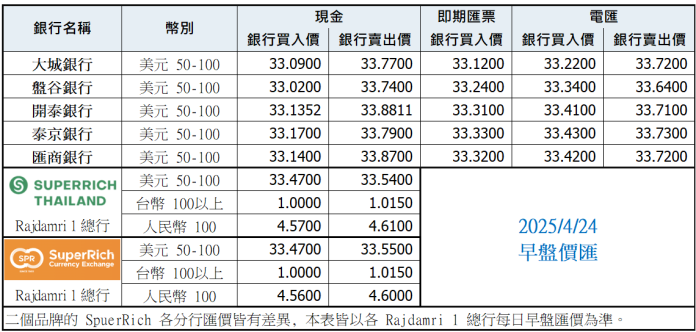 泰銖匯率比較表 4月24日早盤