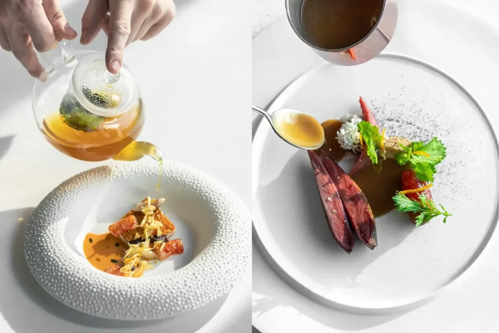 前菜以布列塔尼棕蟹、魚子醬與鳳梨乳液的甜鹹交響驚豔開場,濃郁的海鮮鮮甜與熱帶果香的碰撞,在舌尖綻放出層次豐富的味蕾舞蹈。