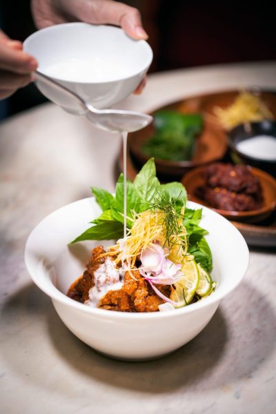 主廚Prin Polsuk堪稱泰國飲食文化的「考古學家」。出身泰國北部農民家庭的他,自幼浸潤于鄉土烹飪傳統,師從「泰國美食非官方大使」Vichit Mukura,又在名廚David Thompson(倫敦米其林泰餐先驅Nahm創始人)麾下錘煉技藝。他帶著人類學家的執著,深入泰國村落搜尋百年食譜手稿,甚至復活了暹羅王朝時期的宮廷冰水香飯(Khao Chae)。但Prin絕非守舊派——他將古法配方與分子料理技術結合,例如以地瓜粉重塑炸鯰魚外皮的酥脆度,或用椰糖焦化技術模擬傳統炭烤風味。