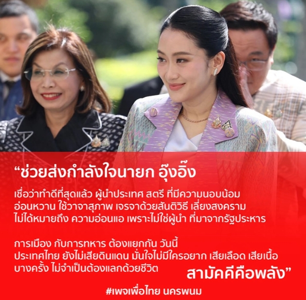 為泰黨粉絲頁還呼籲民眾保持理性,勿讓外部勢力利用內部矛盾製造分裂,強調政治與軍方職能應嚴格區分。當前泰國領土完整無虞,流血衝突絕非必要,團結才是解決問題的核心力量。戰爭只能是最後手段,而領袖以禮相待、尋求和平解決正是負責任的表現。