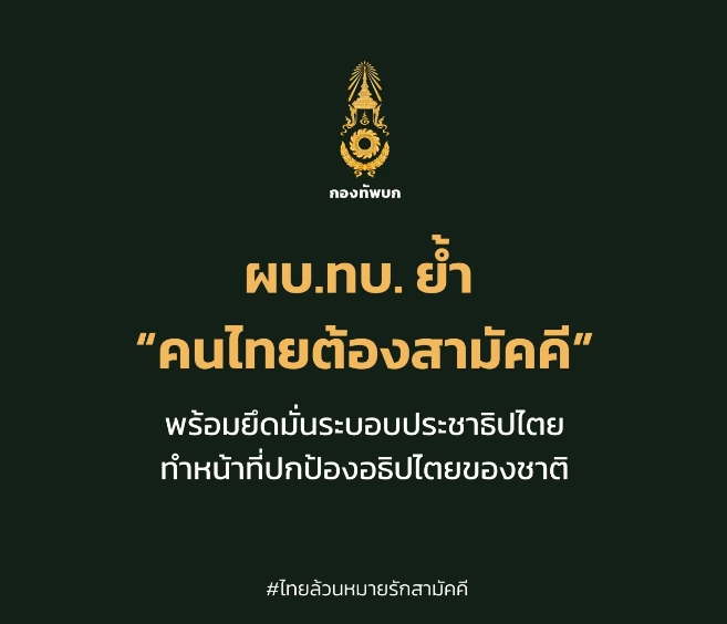 政治政治_圖文稿 陸軍司令呼籲國民團結捍衛國家 分享 FacebookLINE (圖片來源thairath) 【泰國新聞報導】泰國陸軍發言人溫猜少將於19日在位於Ratchadamnoen路的陸軍司令部發佈聲明稱,陸軍總司令帕納上將對當前國內局勢表達關切,針對社會出現的各類資訊及觀點可能造成的廣泛影響,他呼籲泰國人民保持對陸軍的信任。 陸軍總司令強調,陸軍始終堅守以國王為國家元首的民主制度,並將以現有機制全力履行維護國家主權的職責。經全面考量當前形勢,帕納上將指出,現階段最重要之事在於泰國人民必須團結一致,共同抵禦任何不懷好意者對國家主權的侵害,始終以國家利益為重。 ※※※ 未經授權 不得轉載 ※※※