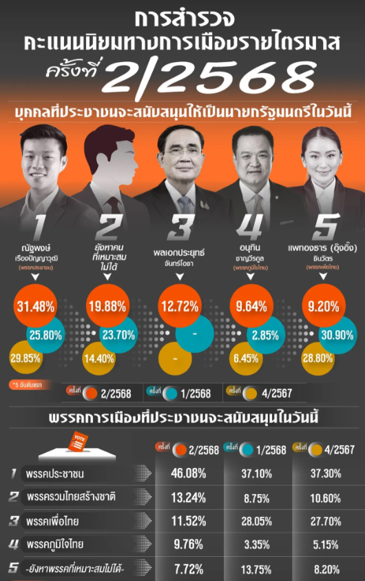【泰國新聞報導】NIDA Poll民調2025年第二季度政治人物支持率排名出爐,人民黨黨魁納塔蓬躍居榜首,巴育將軍位列第3,貝東丹排名第5。政黨支持率方面,人民黨仍為最受歡迎政黨。