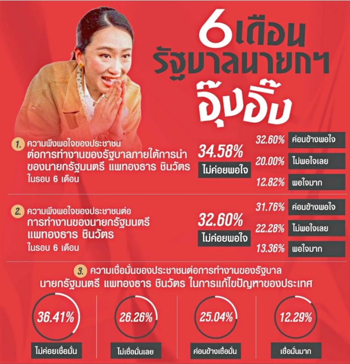 【泰國新聞報導】泰國NIDA POLL民調中心,在全國範圍內收集1310份問卷調查,調查總理貝東丹及其政府各部門在過去6個月的表現,根據結果顯示,有34.58%的人表示不太滿意,20.00%表示非常不滿意,合計達54.58%。