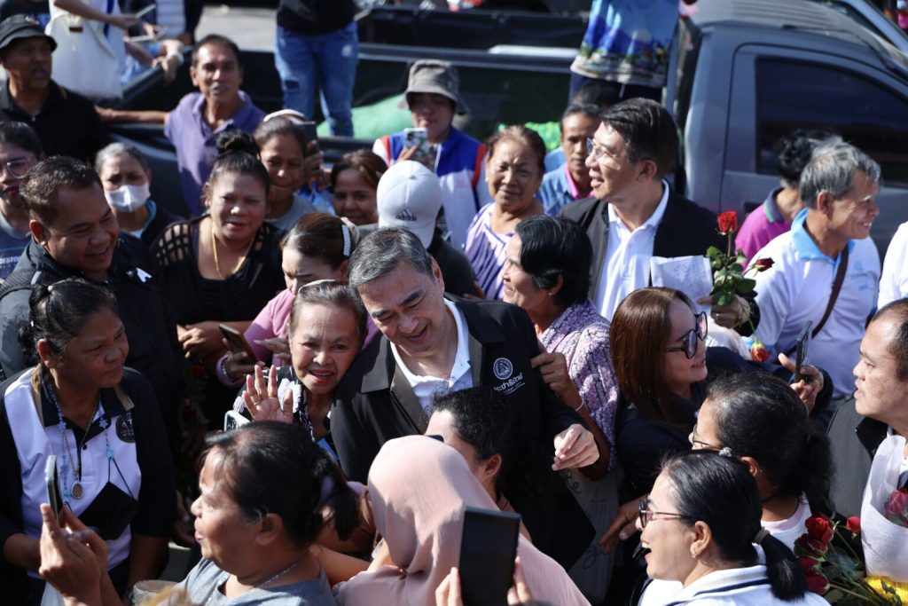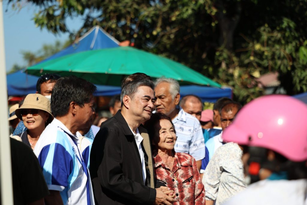 團隊一抵達現場,前來購物的商販與村民便友善地上前迎接,獻上玫瑰花、請求合照並自拍,現場氣氛溫馨熱鬧。還有一位年長的老奶奶特意前來迎接團隊,鄭重地與阿披實先生握手並送上祝福:「希望您能再回來當總理。」此舉引發周圍民眾一片歡呼與喝彩,紛紛表示支持。