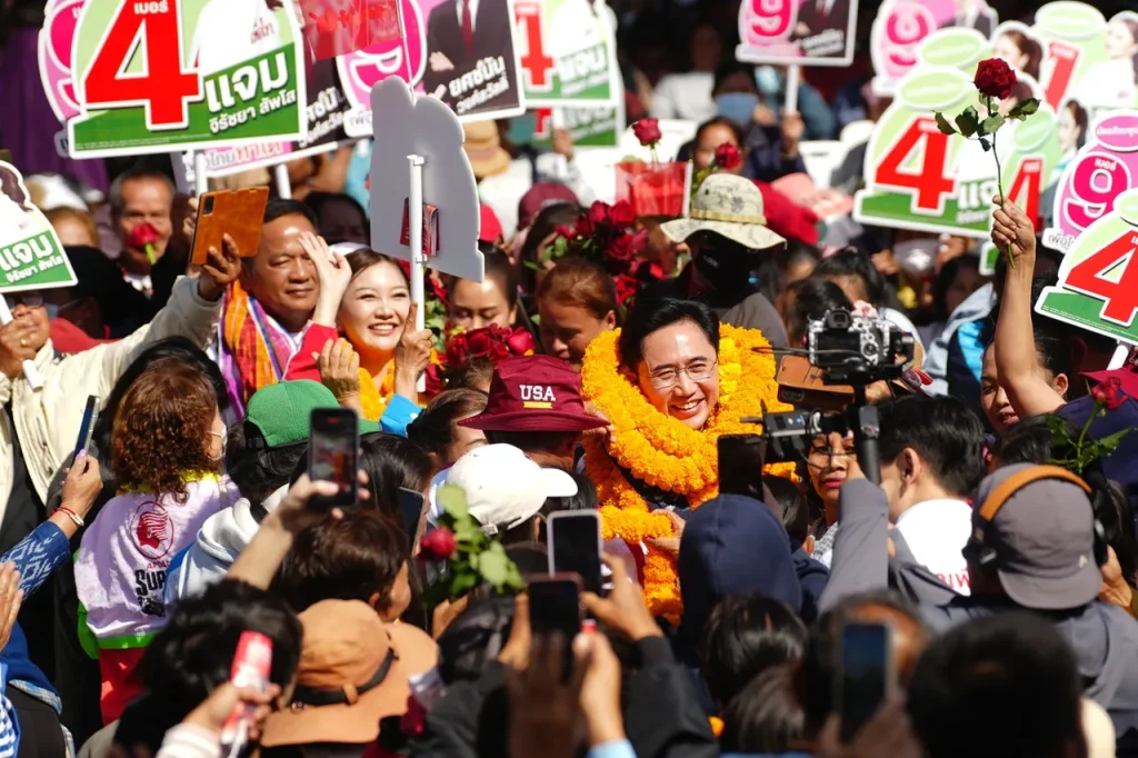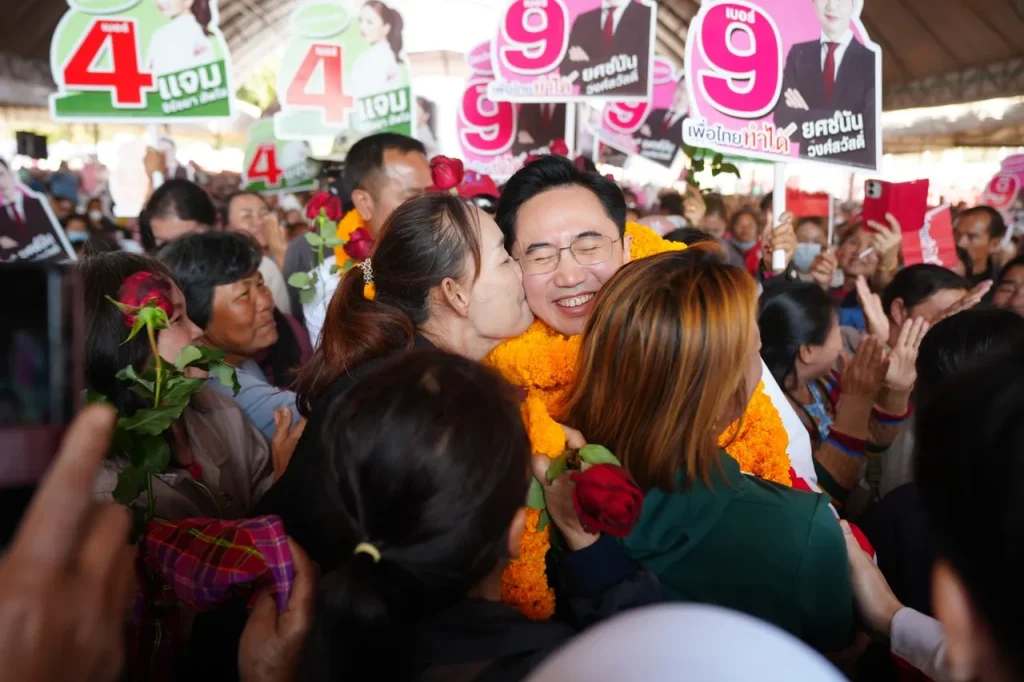 【泰國新聞報導】為泰黨總理候選人育沙南於昨(2日上午10時30分)在色軍府發表演說。遇到村民為其配戴糯米花環,表示已準備好成為第33任總理。