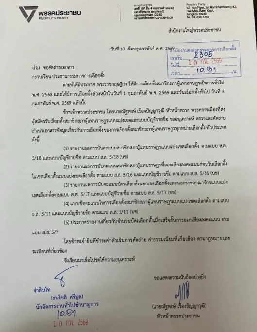 人民黨副發言人卡魯納蓬,2月10日通過社交媒體發佈由黨魁納塔蓬簽署、致泰國選舉委員會主席的正式信函,該信函針對2月1日及8日舉行的選舉,請求依法獲取相關選舉檔副本。
