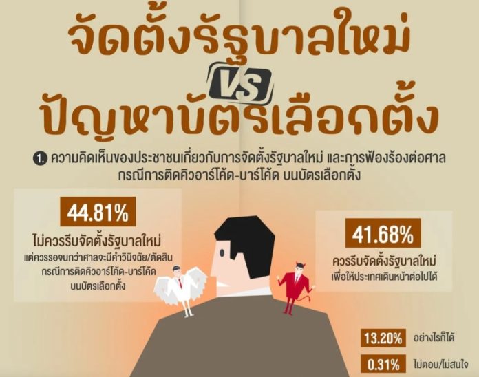 NIDA民調中心的調查於3月2日至4日進行,物件為全國18歲以上、不同教育程度、職業和收入的民眾,樣本總數達1,310人。調查結果顯示,對於在選票上印製二維碼/條碼被訴至法院一案,是否應組建新政府的問題;44.81%的受訪者認為,不應急於組建新政府,而應等待法院對此案作出判決。41.68%的受訪者認為,應該儘快組建新政府,以便國家能夠繼續向前發展。另有13.20%的受訪者表示無所謂,0.31%的人不回答或不感興趣。