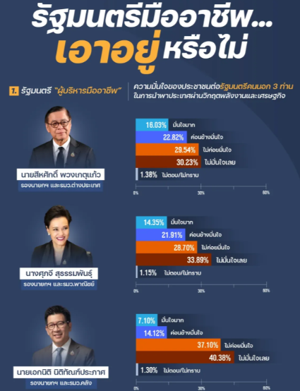 【泰國新聞報導】NIDA民調顯示,民眾對3名部長,蘇帕吉、西哈薩、艾尼迪解決能源與經濟危機缺乏信心。