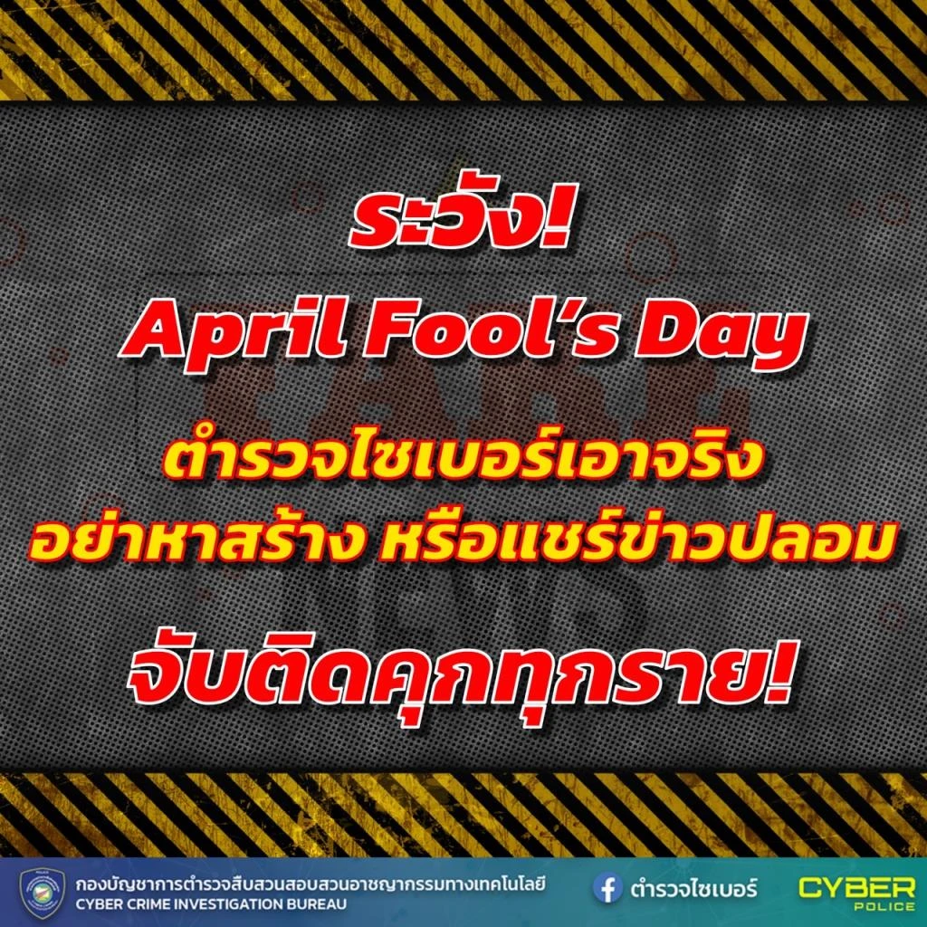 【泰國新聞報導】泰國網路警察特別警告,今天是4月1日「愚人節」,任何人若在社群媒體上散布、或轉發虛假資訊,將依法嚴懲,最高可面臨5年監禁與罰款10萬銖。
