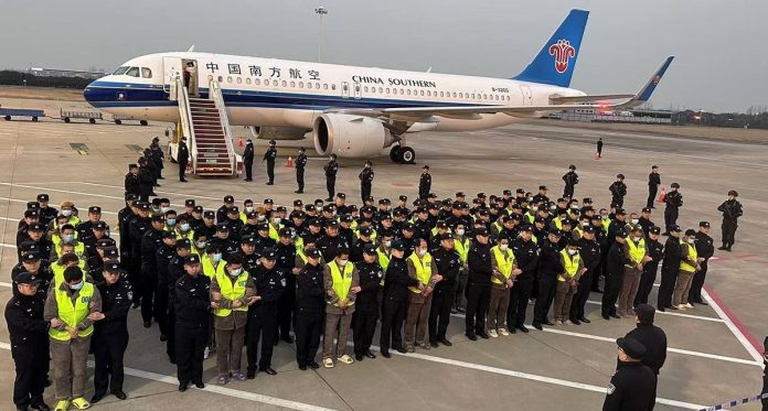 這些嫌疑犯先被送至泰國達府湄索地區,隨後又搭乘四架包機返回中國南京。公共安全部補充,未來幾天還將有超過800名詐騙嫌疑犯被遣返。