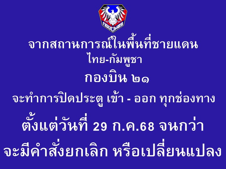 與此同時,最新消息顯示,07:02時第21航空聯隊Wing 21臉書專頁發佈公告稱:特此通告,因泰柬邊境區域局勢,第21航空聯隊自2025年7月29日起關閉所有進出通道,直至取消或變更指令下達,不便之處敬請諒解。