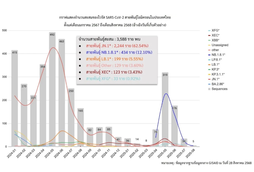 根據泰國衛生部醫學科學部9月30日最新疫情通報,被命名為Stratus的新冠病毒XFG變異株正在全球範圍內加速傳播,儘管尚無明確證據表明該毒株會導致更嚴重臨床症狀。醫學科學部主任永育博士透露,泰國於2025年4月首次檢測到XFG變異株,截至同年9月24日,累計報告33例確診病例,其中第13衛生轄區共發現23例。多數患者僅出現發熱、咳嗽、咽喉痛、流涕及頭痛等輕微症狀,目前無需住院治療。