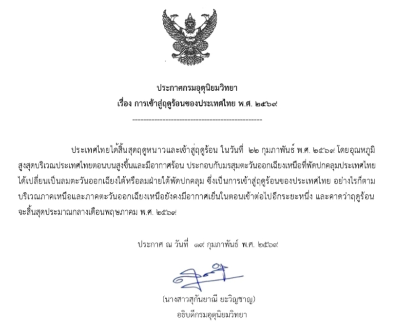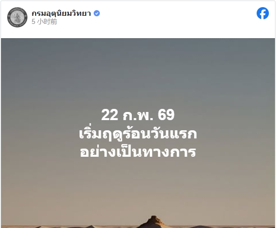 綜合綜合_圖文稿 今年夏季來得早 2月22日入夏 2026 年 2 月 23 日 FacebookLINE (圖片來源氣象廳粉絲頁) 【泰國新聞報導】泰國氣象廳官方臉書頁面2月22日發佈消息宣佈,泰國已於2月22日正式進入夏季,今年的夏季來得比往年早,預計將會將在5月中旬結束。 根據泰國氣象廳22日的公告,泰國已結束冬季,並於2月22日進入夏季,由於泰國北部地方最高氣溫升高,天氣炎熱,同時,覆蓋泰國上空的東北季風已轉變為東南風、或南風,標誌著泰國正式進入夏季。 氣象廳指出,泰國北部和東北部地區在未來一段時間內,清晨仍將維持涼爽天氣。預計今年夏季將持續至5月中旬左右。 ※※※ 未經授權 不得轉載 ※※※