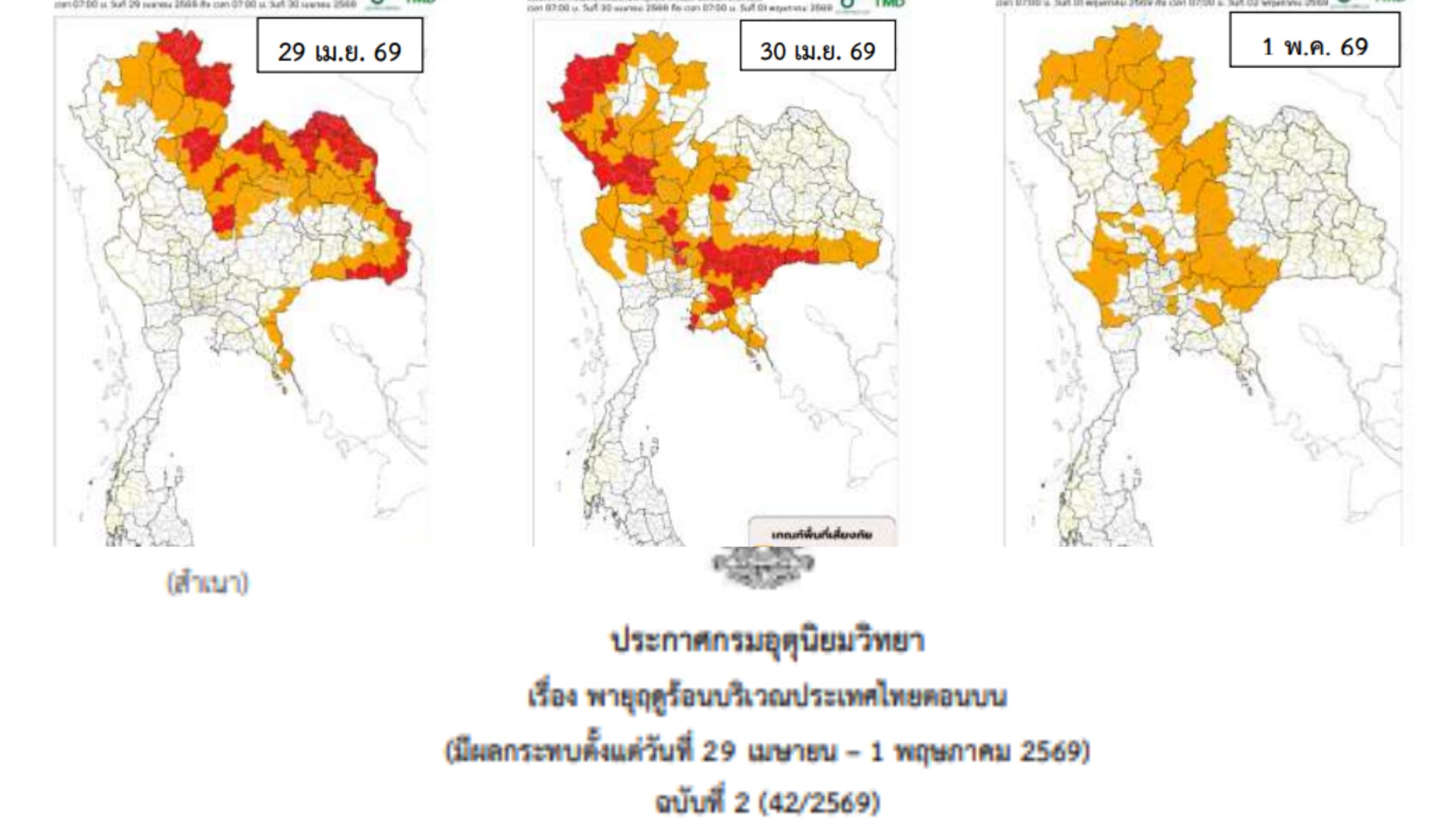 【泰國新聞報導】泰國氣象部門今日(4月28日)發布關於泰國北部地區夏季風暴2026年第42/2569號的天氣預警。預警指出,自4月29日至5月1日,泰國北部地區將出現季風風暴,伴隨雷雨、強風、冰雹及局部地區強降雨,部分區域可能發生雷擊。