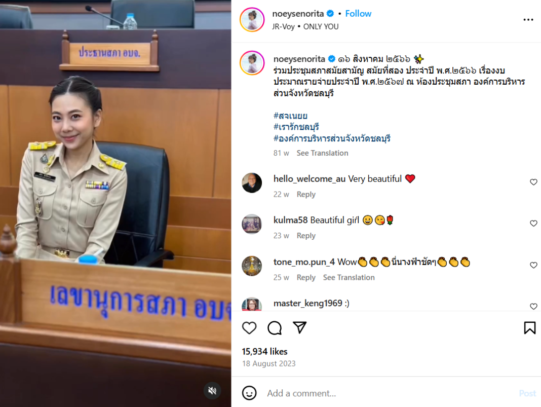 她在社群平台上發布身穿公務制服的照片,並留言表示,正式擔任春武里府行政機關秘書,感謝各位長輩給予機會,也感謝大家的支持與鼓勵。我會全力以赴,為春武里府的民眾貢獻心力。