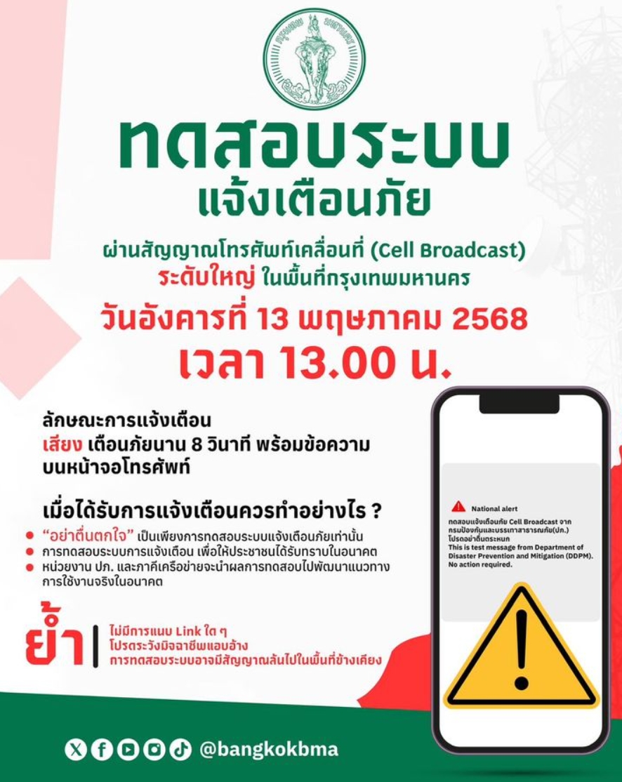 防災減災廳13日下午13時在曼谷、清邁、大城府、洛坤府和烏隆府同步測試大規模災害警報系統。測試期間,貝東丹總理正在總理府主持南部邊境安全會議。14時05分,防災減災廳廳長帕薩功協同三大運營商赴總理府彙報測試結果,並針對總理府區域進行專項複測。